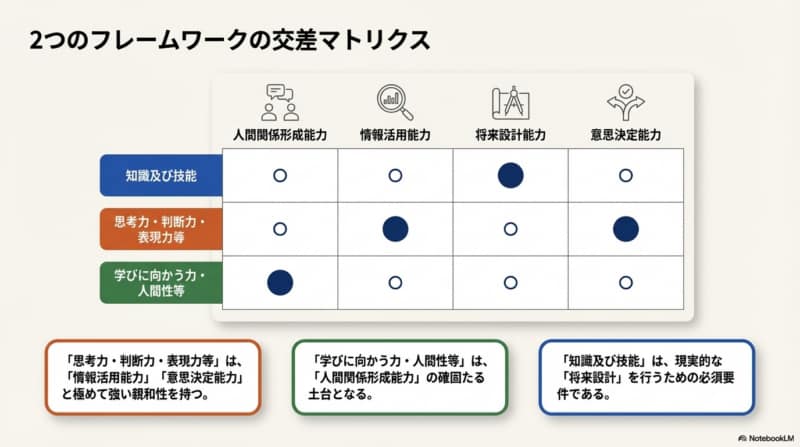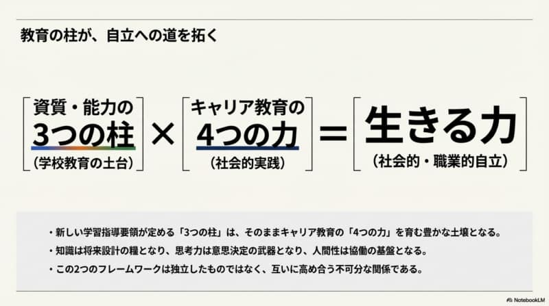 「資質・能力の3つの柱」と「キャリア教育の4つの能力」の関係は、一言で言えば「学びの道具箱(3つの柱)」と「人生のOS(4つの能力)」の関係です。